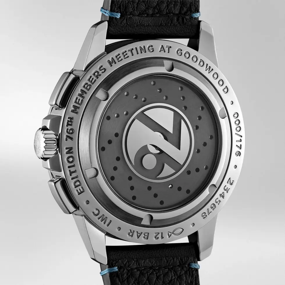 - Aesthetic touches include silver-plated dial, black subdials, blue chronograph hands, and a special “76” motif on the case back celebrating Goodwood. (DEPLOYANT)